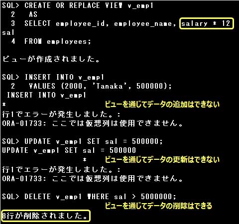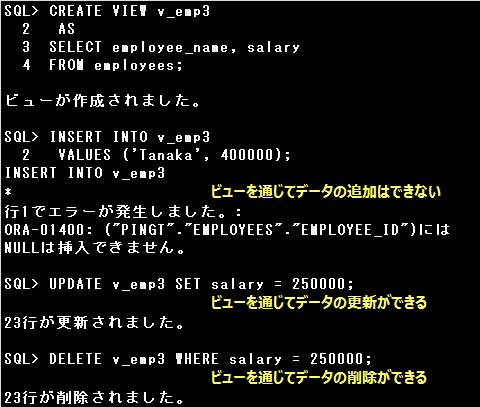 なお、実表に制約が定義されている場合は、ビューを通したデータの操作時にも制約のチェックが行われます。制約を満たさないデータの操作はできません。