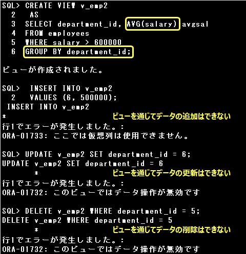 ビュー2はビューの定義にGROUP BY句とグループ関数が使用されているため、データの追加、更新、削除の全てを行うことができません。