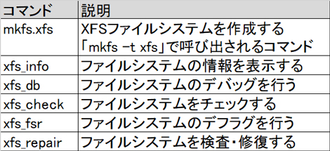 XFSファイルシステムを管理するために使用される主なコマンドは以下のとおりです。
